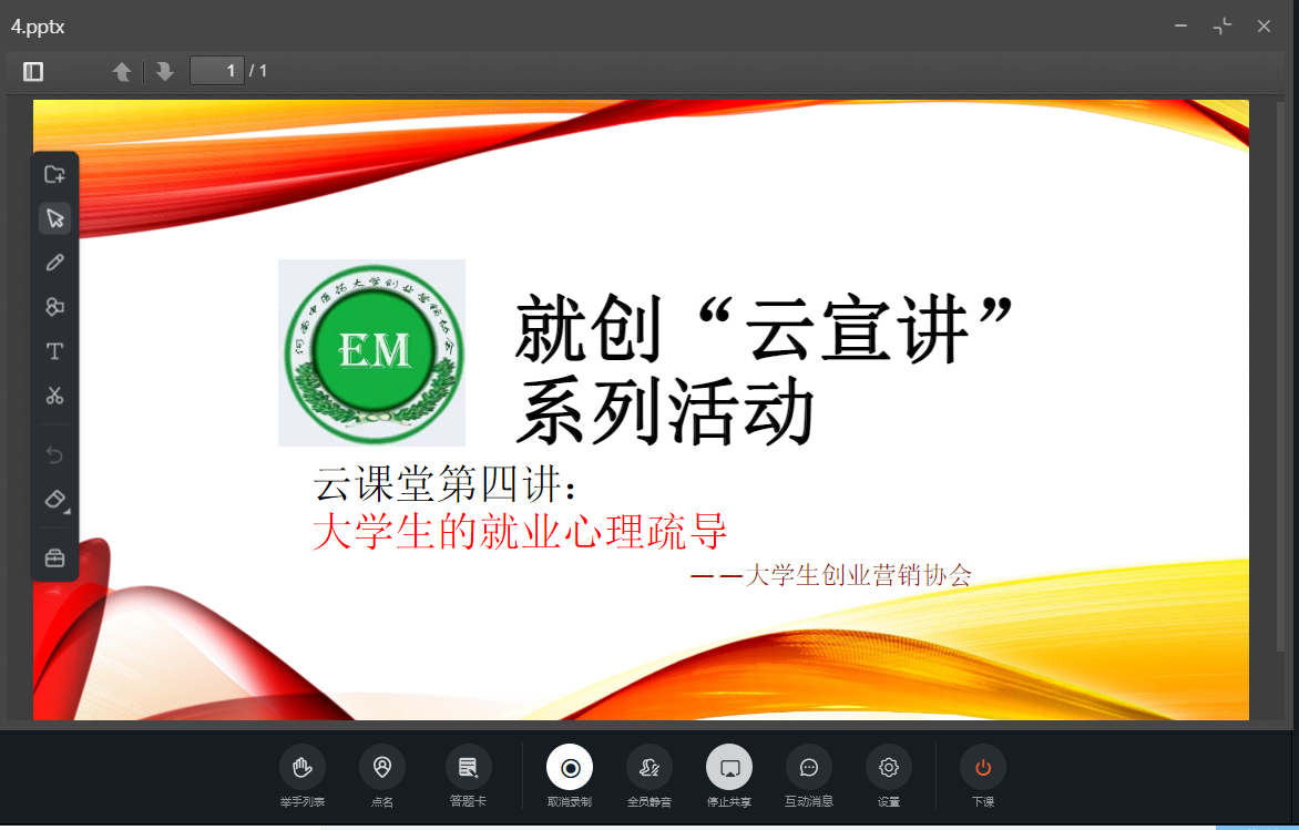 (图:黄含彬,文:郏彦娥 高巍)为进一步增强同学们的就业信心,以更加饱满的精神状态迎接职场挑战,ok138cn太阳集团529大学生创业营销协会于2021年5月9日上午,在线上举办了以疫情形式下的大学生就业心理疏导为主题的就创“云课堂”第四讲活动。